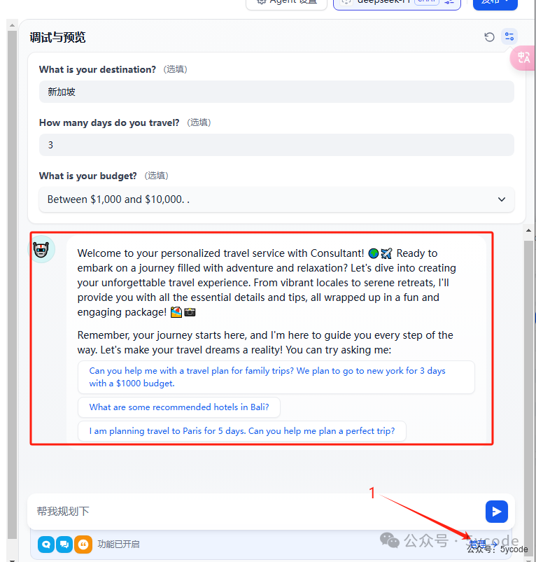 模型参数: 通过点击5,弹出区域6,我们可以配置模型的温度、TopP,最大标记、回复格式 等。